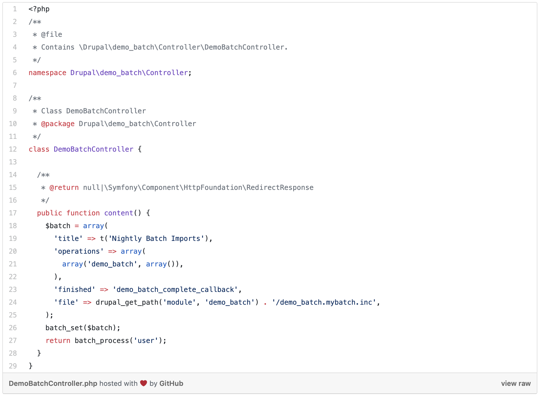 Creating a batch process in Drupal 8 is relatively straightforward. Here is what you will need to get started: