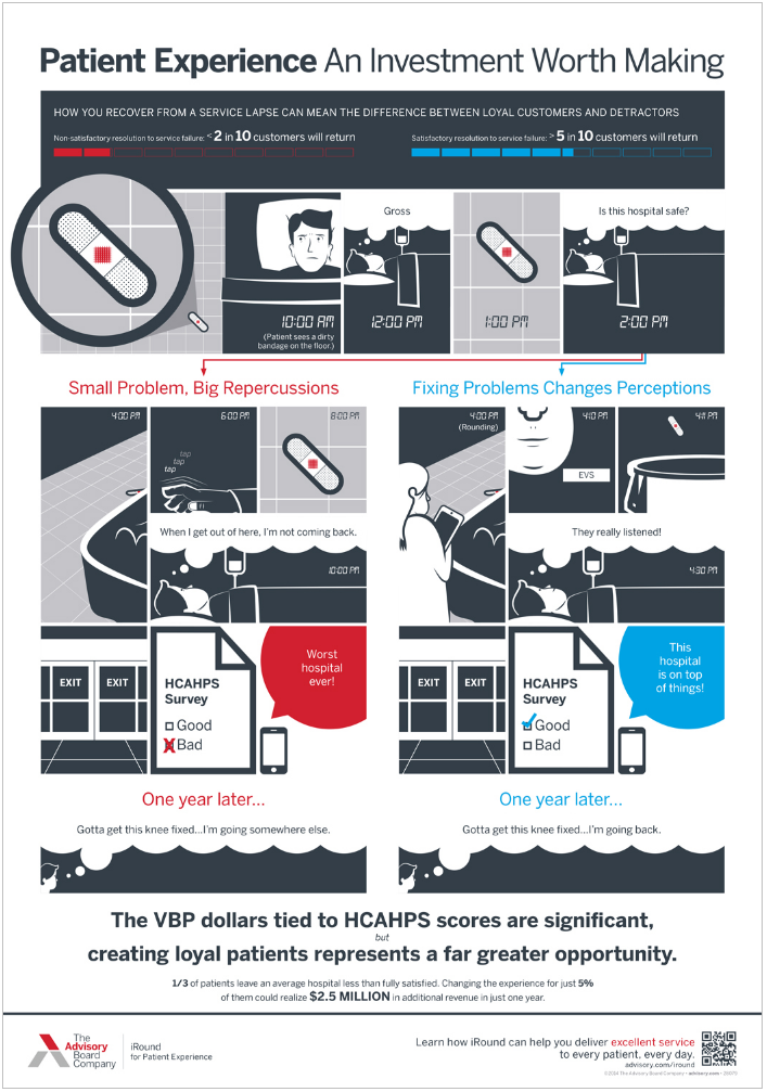 In the retail realm, teams sweep the store aisle-by-aisle before leaving at night to ensure products are properly stocked, in their correct positions on the shelves, and that all sales or clearance placards are up-to-date. The following graphic from The Advisory Board demonstrates how maintaining a clean and responsive hospital affects the patient experience—and a patient’s likelihood for scoring and sharing a high patient experience with peers.