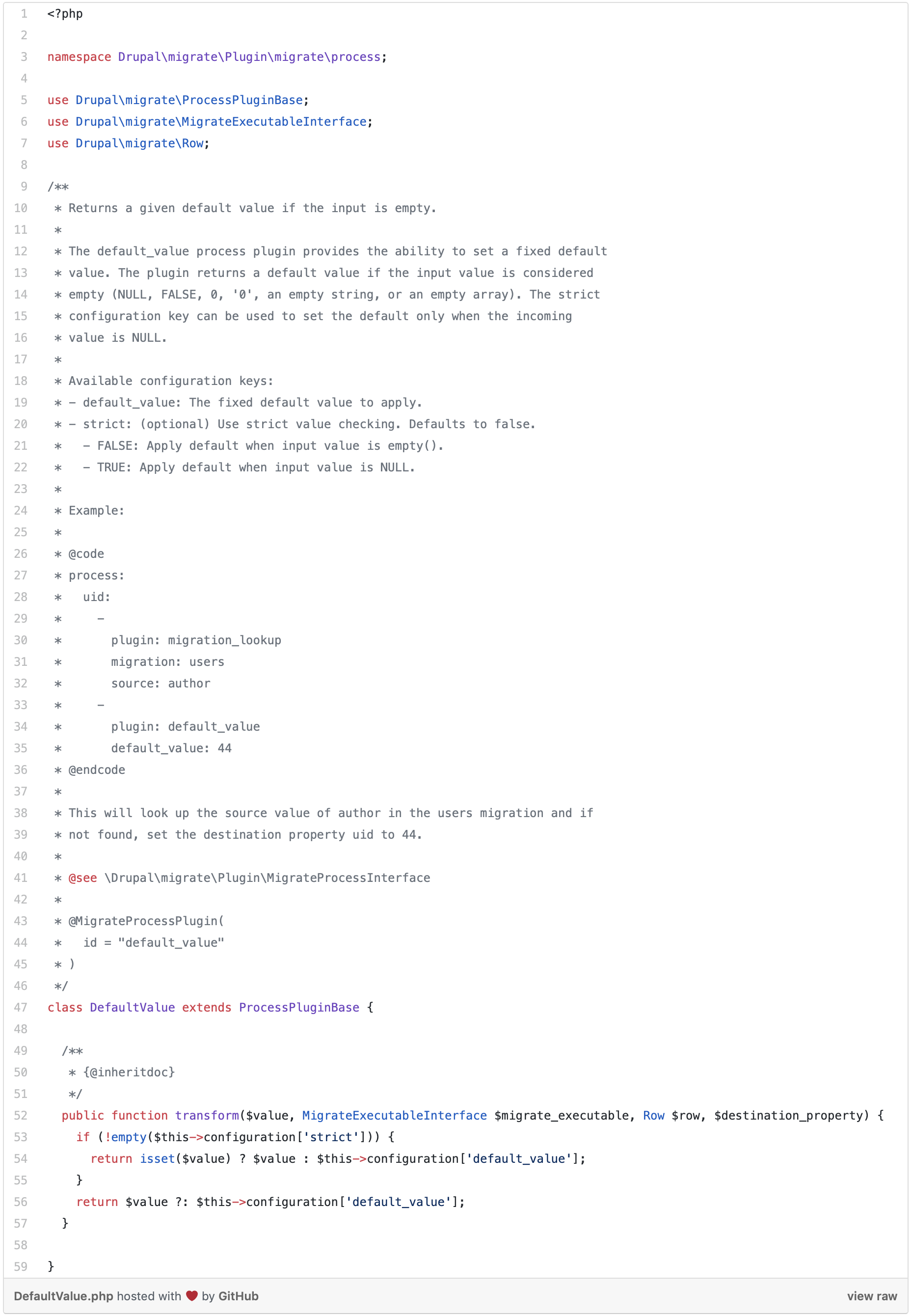 Let’s take a look at a simple MigrateProcessPlugin as an example to get us started.