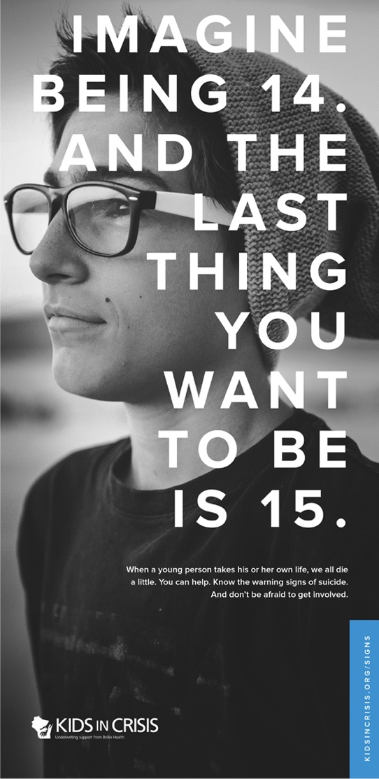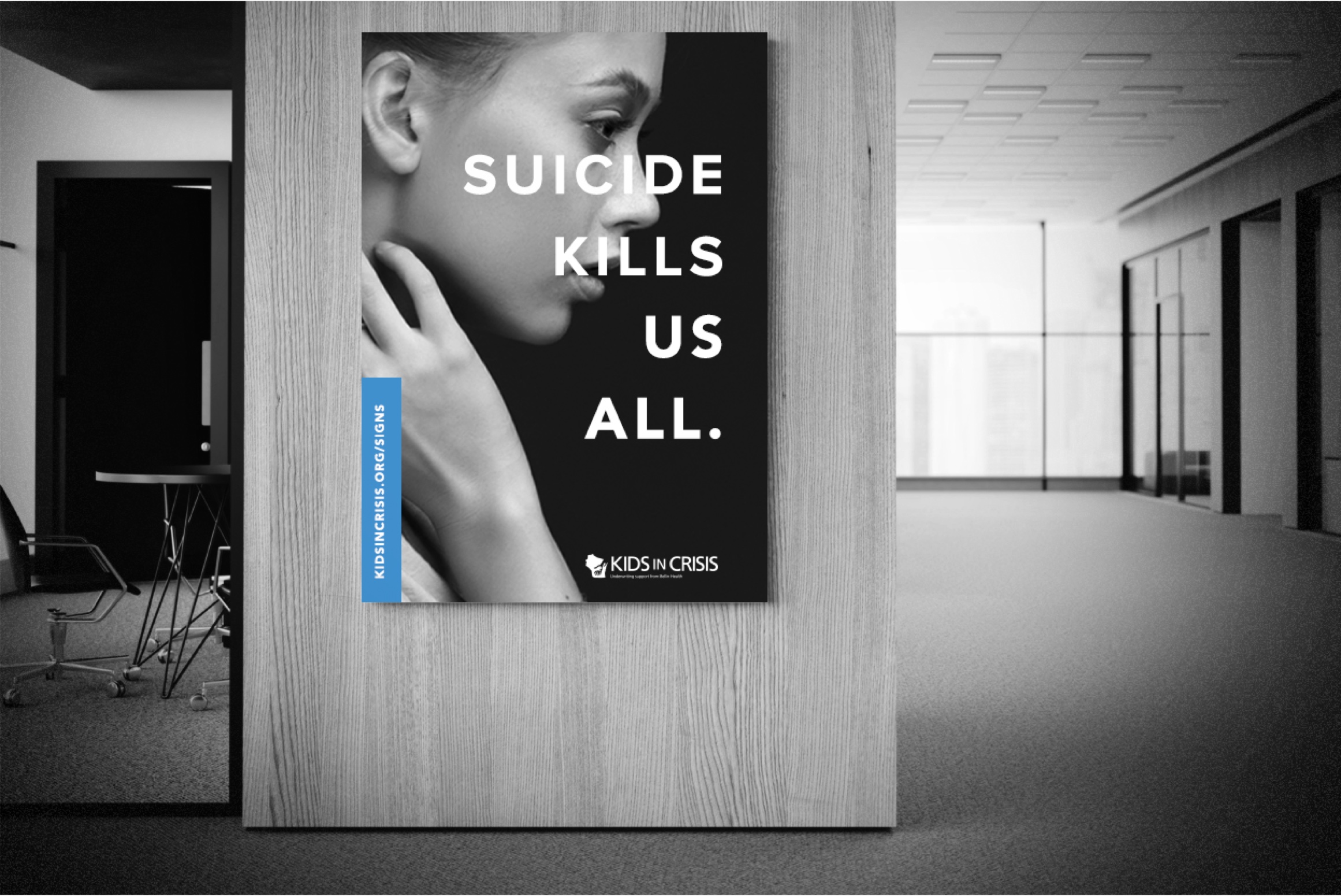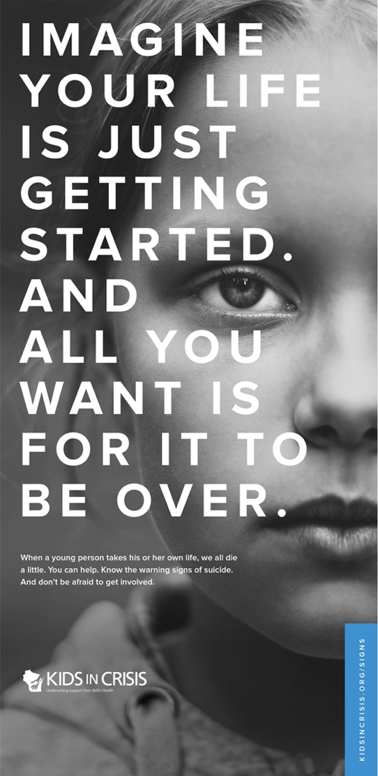 Kids In Crisis works to bring attention to the growing problem of suicide among children and teens. Nationwide, the trend is devastating and affects every aspect of society. We created a campaign that urges all of us to be aware of what our kids are going through, and to take it all very seriously.