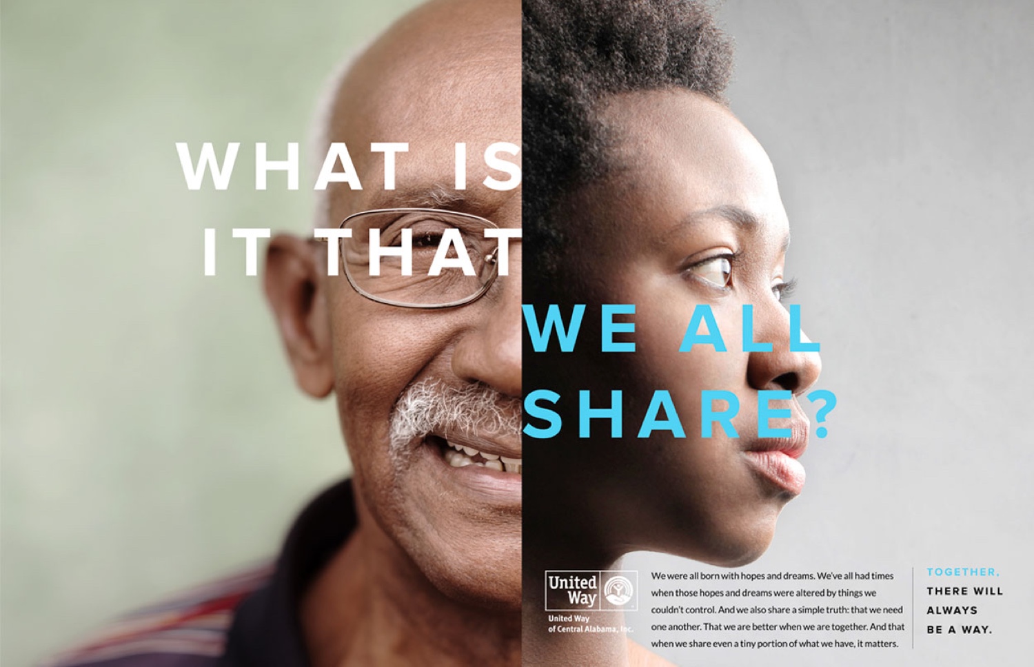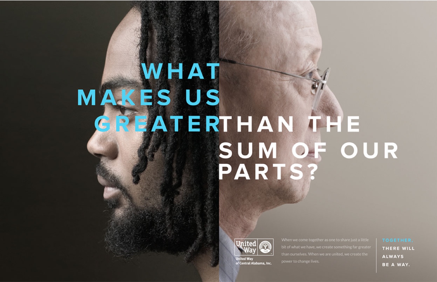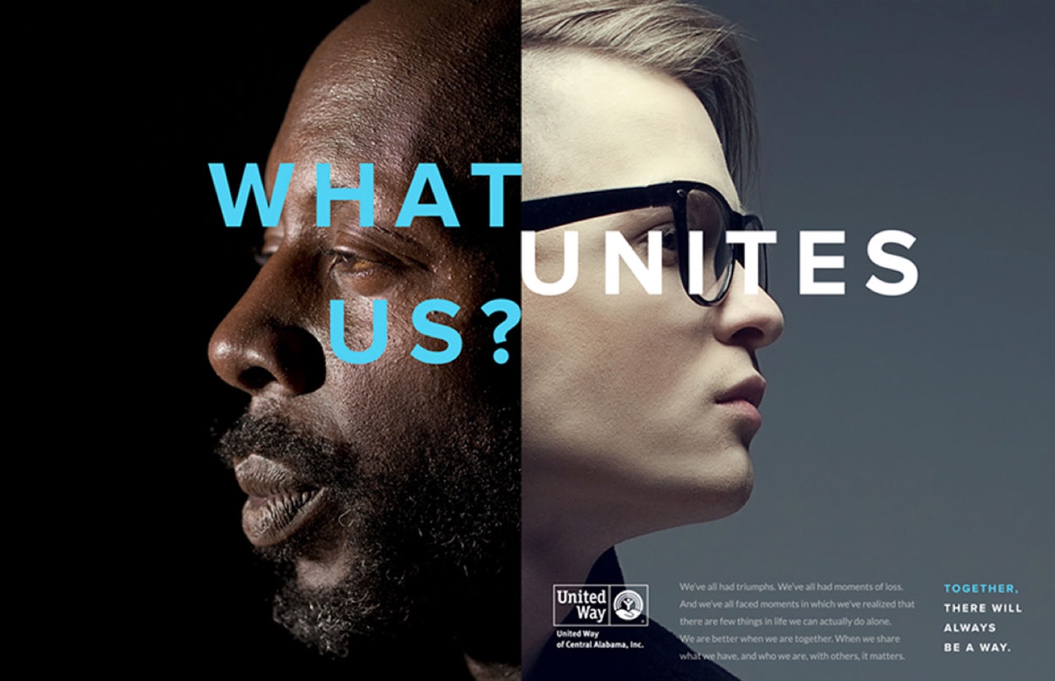In creating the marketing campaign for United Way of Central Alabama’s 2016 fundraising efforts, we knew that the challenge would be to overcome the divisiveness and polarization of a contentious political season. The answer lay in giving Central Alabama exactly what politics couldn’t: unity through a sense of purpose. Our solution was to emphasize visually and thematically that, despite apparent outward differences, people can be united in common cause.